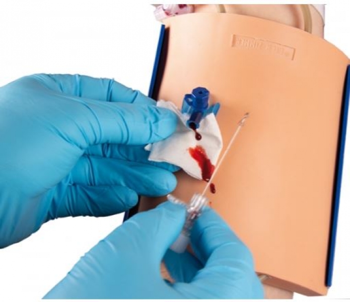 Mit diesem umschnallbaren IV Punktionspad ist es möglich, in direkter Interaktion mit dem Simulationspatienten das Punktieren am Arm oder Bein zu üben, ohne dass die Gefahr einer tasächlichen Verletzung besteht.