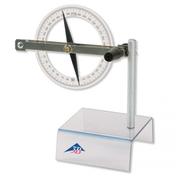 Aluminiumleiterschleife mit 4-mm-Sicherheitsbuchsen, spitzengelagerte Magnetnadel über transparentem Vollkreis mit Winkelskala, drehbar um die horizontale Achse, auf Acrylglassockel.