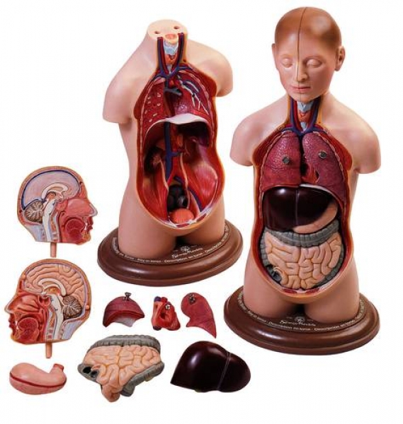 etwa 1/3 natürlicher Größe, aus SOMSO-Plast®. In 9 Teile wie folgt zerlegbar: Kopf median geschnitten (2), rechter und linker Lungenflügel, Herz, Leber, Magen, Dünn- und Dickdarm, Torso, auf grünem Sockel, abnehmbar.