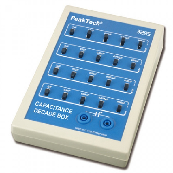 Kapazitätsdekade in schlagfestem Kunststoffgehäuse. Mit mechanisch stabilen Komponenten, Schiebeschalter zur Einstellung der Messbereiche und 4-mm-Sicherheitsbuchsen für eine sichere Verbindung.