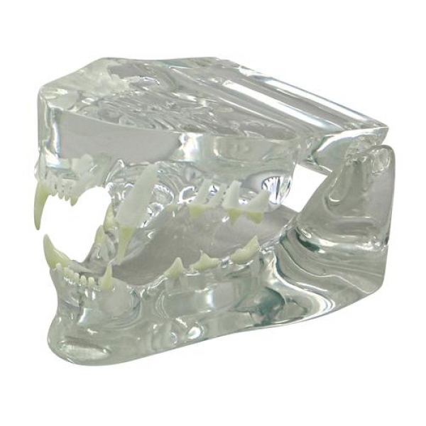 Gesunder Hunde- und Katzenkiefer, klappbar, der die Wurzeln aller Zähne (Schneidezähne, Hunde- Prämolaren, Backenzähne) anzeigt. Kiefer geöffnet, geschlossen und getrennt für eine nähere Untersuchung.