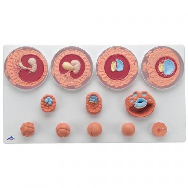 Das Modell repräsentiert die Entwicklung des menschlichen Keimes von der Befruchtung bis zum Ende des 2. Schwangerschaftsmonats in 12 Stadien.