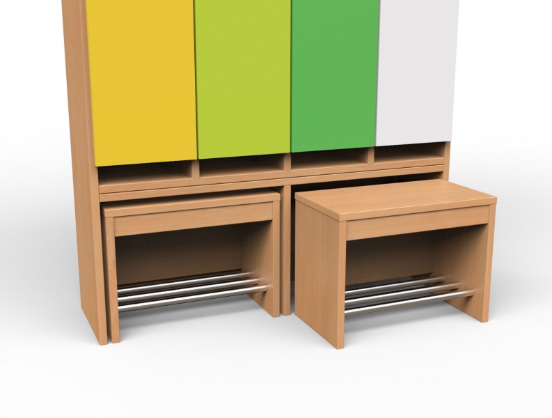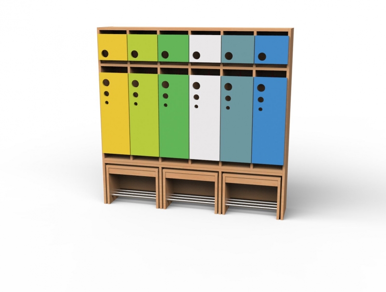 Korpus-Garderobe "Modern-Line" 6 Plätze BxHxT 150,2 x 142 x 28 / 50 cm mit ausziehbarer Garderoben-Sitzbank mit Alu-Rost und Aufsatz-Element: unten: große Türen, Griffloch mit Seifenblasen-Optik darüber: kleine Türen Griffloch mit Seifenblasen-Optik Je Abteil mit 1 3-fach Kunststoff-Haken Die Lieferung erfolgt Frei Haus bis 1. Obergeschoss, inkl. Aufbau / Montage.