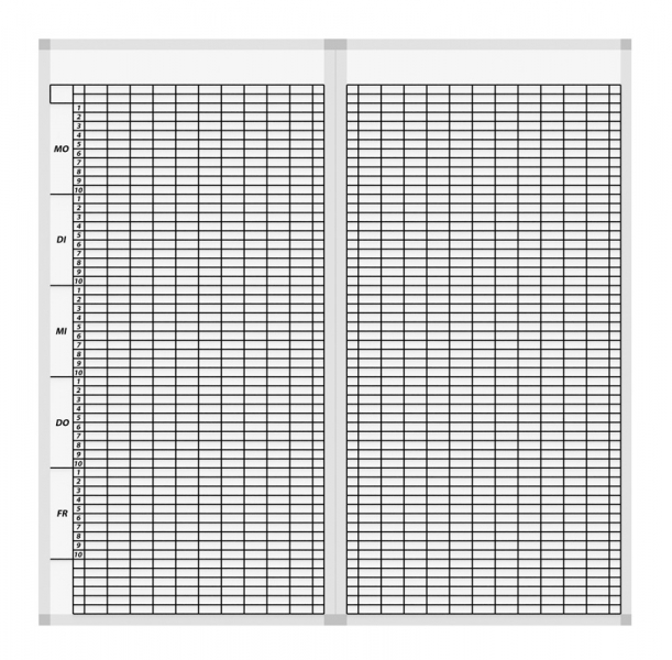 Stundenplan Baukasten: Die Anfangstafel ist mit einem gedruckten Raster (schwarz) mit Tagesspalte (MO-FR), Stundenspalte ( 12 Tagesstunden) und 10 nutzbare Klassenspalten versehen. Erweiterungen sind jeweils in 10er Schritten (pro Erweiterungsfläche 10 Klassenspalten, Modell CMP10-12WBB) theoretisch unendlich möglich!