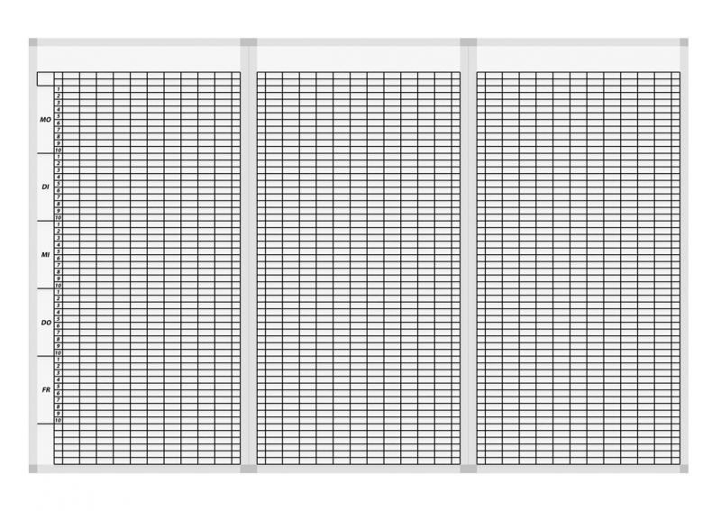 Stundenplan Baukasten: Die Anfangstafel ist mit einem gedruckten Raster (schwarz) mit Tagesspalte (MO-FR), Stundenspalte ( 12 Tagesstunden) und 10 nutzbare Klassenspalten versehen. Erweiterungen sind jeweils in 10er Schritten (pro Erweiterungsfläche 10 Klassenspalten, Modell CMP10-12WBB) theoretisch unendlich möglich!
