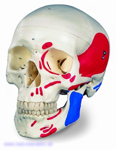 Die Muskelursprünge (rot) und -ansätze (blau) sind auf der linken Schädelseite farbig dargestellt. Mit Nummerierung der Schädelknochen und -strukturen auf der rechten Seite. Der Schädel benennt über 140 anatomische Details.