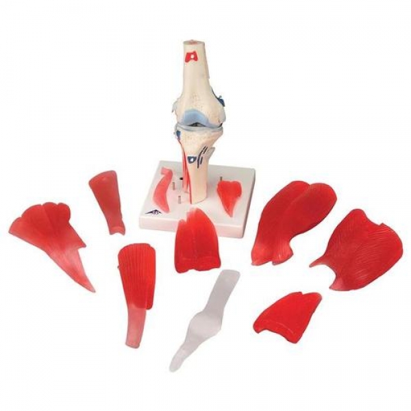 Wir freuen uns, mit diesem 12-teiligen Kniemodell eine ausgezeichnete Ergänzung zu unserem Sortiment an Gelenkmodellen mit Muskulatur anzubieten. Es zeigt verschiedene abnehmbare Muskeln und Muskelanteile im Kniebereich.