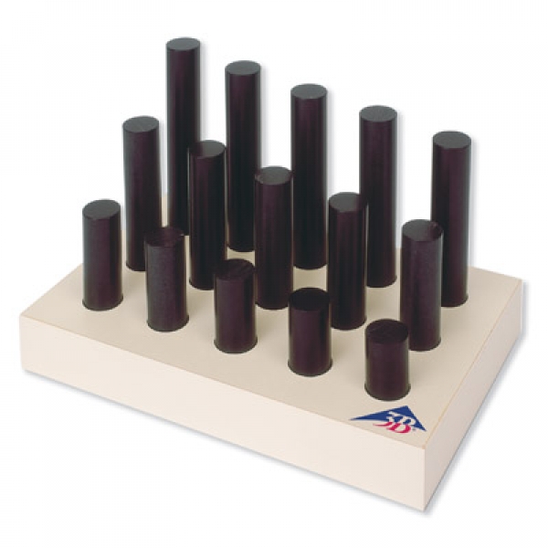 Bestehend aus 15 Probekörpern verschiedener Masse aus zwei Materialien gleichen Aussehens auf einem Aufbewahrungstablett.
