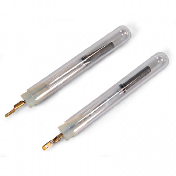 Paar Kohlenstoffelektroden zur Verwendung im Hofmann'schen Wasserzersetzungsapparat S (Artikelnummer: 1003507) für die Analyse von Ammoniaklösungen, Kochsalzlösungen oder andere chloridhaltige Lösungen.