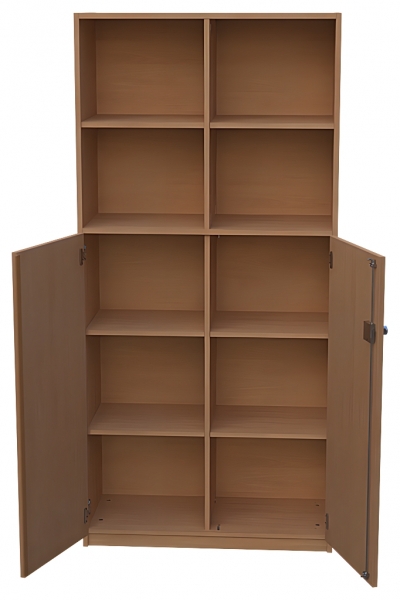 Kombischrank, BxHxT 90 x 190 x 40 cm oben: offen, Mittelwand,2 x 1 Einlegebodendarunter: 1 fester Fachbodenunten: 2 Türen, abschließbar, Dreholive, Mittelwand,2 x 2 Einlegeböden