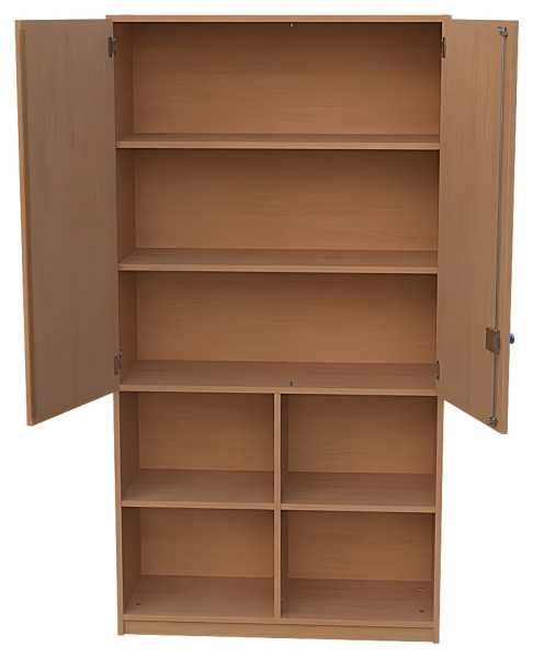 Kombischrank, BxHxT 100 x 190 x 40 cm unten: offen, Mittelwand,2 x 1 Einlegebödendarunter: 1 fester Fachbodenoben: 2 Türen, abschließbar, Dreholive, 2 Einlegeböden