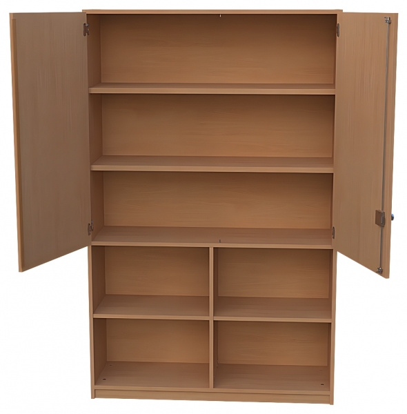 Kombischrank, BxHxT 120 x 190 x 40 cm unten: offen, Mittelwand,2 x 1 Einlegebödendarunter: 1 fester Fachbodenoben: 2 Türen, abschließbar, Dreholive, 2 Einlegeböden