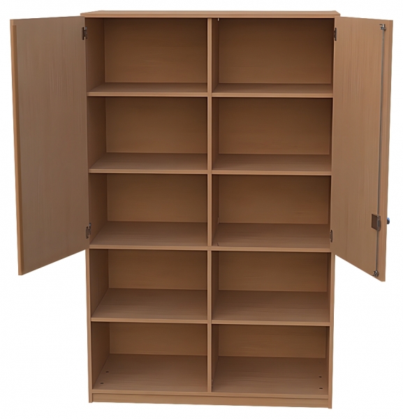 Kombischrank, BxHxT 120 x 190 x 60 cmunten: offen, Mittelwand,2 x 1 Einlegebödendarunter: 1 fester Fachbodenoben: 2 Türen, abschließbar, Dreholive, Mittelwand,2 x 2 Einlegeböden