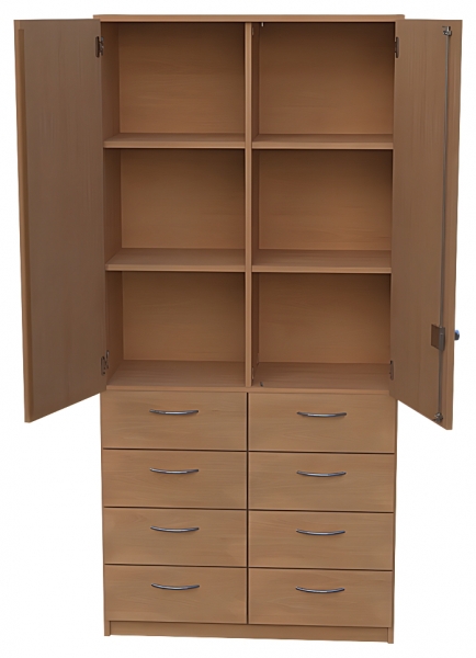 Kombischrank, BxHxT 90 x 190 x 40 cm oben: 2 Türen, abschließbar, Dreholive, Mittelwand,2 x 2 Einlegeböden unten: 2 x 4 Schubkästen,Segmentbogengriffe( RM 128 mm ) verchromt matt,SoftClose Auszüge lichte Nutzlänge der Schubkästenbeträgt 33 cm
