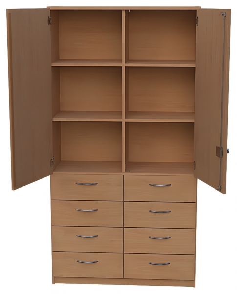 Kombischrank, BxHxT 100 x 190 x 40 cm oben: 2 Türen, abschließbar, Dreholive, Mittelwand,2 x 2 Einlegeböden unten: 2 x 4 Schubkästen,Segmentbogengriffe( RM 128 mm ) verchromt matt,SoftClose Auszüge lichte Nutzlänge der Schubkästenbeträgt 33 cm