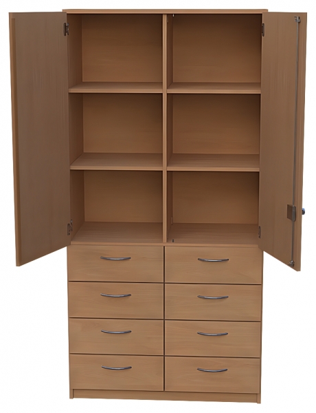 Kombischrank, BxHxT 95 x 190 x 50 cm oben: 2 Türen, abschließbar, Dreholive, Mittelwand,2 x 2 Einlegeböden unten: 2 x 4 Schubkästen,Segmentbogengriffe( RM 128 mm ) verchromt matt,SoftClose Auszüge lichte Nutzlänge der Schubkästenbeträgt 33 cm