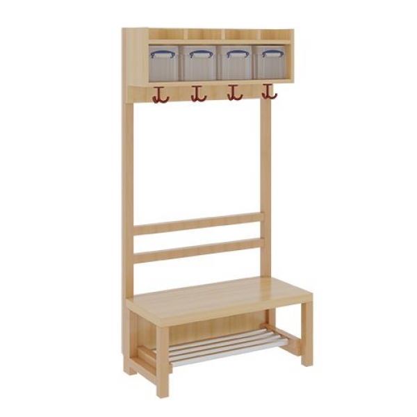 Unsere Komplettgarderoben sind infolge der Fertigung aus lackierten Stützen- und Bankgestellrahmen, 4x4 cm massiven Buche-Holzstollen sehr robust und dauerhaft. Die Garderobenstützen haben wandseitig eine Ausklinkung für Sockelleisten. Zwischen den Garderobenstützen sind aus dem gleichen Material Rückenlehnen-Stollen montiert. In den Fachablagen aus melaminbeschichteter Spanplatte stehen Boxen mit Deckel und darüber 5 cm hohe Ablagen. Unter der Fachablage sind in Anzahl der Plätze farbige drehbare Dreifachhaken montiert. Die Sitzfläche besteht ebenfalls aus stabiler melaminbeschichteter Spanplatte, das Dekor ist wählbar. Darunter befindet sich ein Schuhrost aus mit RAL 9006 pulverbeschichteten robusten Aluminiumrohren.