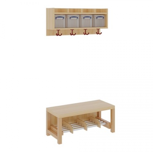 Unsere Komplettgarderoben sind infolge der Fertigung aus lackierten Stützen- und Bankgestellrahmen, 4x4 cm massiven Buche-Holzstollen sehr robust und dauerhaft. In den Fachablagen aus melaminbeschichteter Spanplatte stehen Boxen mit Deckel und darüber 5 cm hohe Ablagen. Unter der Fachablage sind in Anzahl der Plätze farbige drehbare Dreifachhaken montiert. Die Sitzfläche besteht ebenfalls aus stabiler melaminbeschichteter Spanplatte, das Dekor ist wählbar. Darunter befindet sich ein Schuhrost aus mit RAL 9006 pulverbeschichteten robusten Aluminiumrohren. Die Breite und damit die Anzahl der Sitzplätze sowie die gewünschte Sitzhöhe sind wählbar. Die Sitzfläche ist 35 cm tief.