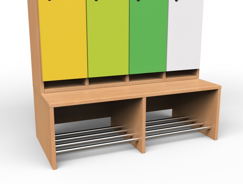 Korpus-Garderobe "Modern-Line" 3 Plätze BxHxT 76,1 x 142 x 28 / 50 cm mit fester Garderoben-Sitzbank mit Alu-Rost und Aufsatz-Element: unten: große Türen, Griffloch mit Seifenblasen-Optik darüber: kleine Türen Griffloch mit Seifenblasen-Optik Je Abteil mit 1 3-fach Kunststoff-Haken Die Lieferung erfolgt Frei Haus bis 1. Obergeschoss, inkl. Aufbau / Montage.