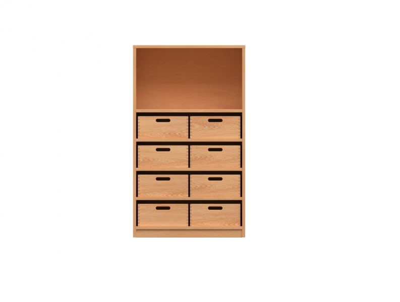 Korpusschrank, BxHxT 70x120x40 cm oben: offen, unten: offen, 3 Fachböden 2x4 Materialkästen mit Griffloch Kästen: Buche natur, lackiert