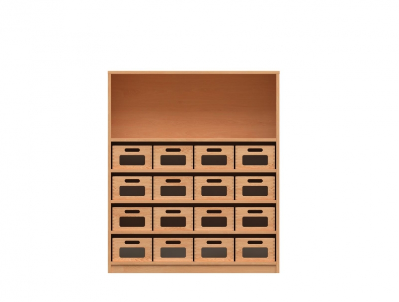 Korpusschrank, BxHxT 102x120x40 cm oben: offenes Fach unten: offen, 3 Fachböden 4x4 Materialkästen mit Acrylfenster mit Griffloch Kästen: Buche, natur, lackiert