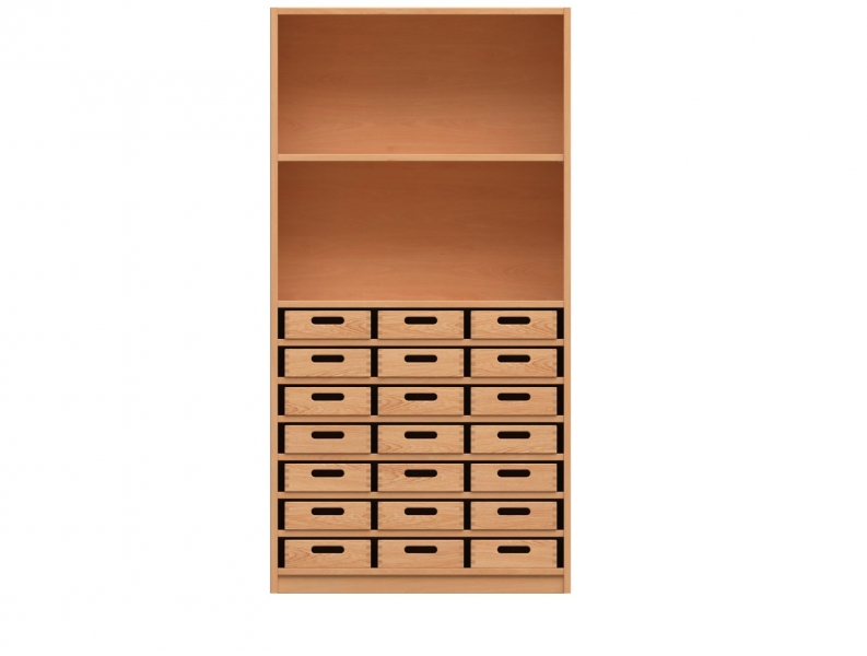 Korpusschrank, BxHxT 82x160x40 cm oben: offen, 1 fester Fachboden unten: 6 Einlegeböden 3x7 Materialkästen mit Griffloch Kästen: Buche natur, lackiert