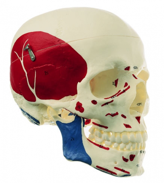 Naturabguß, aus SOMSO-Plast®. Ausführung wie QS 7/1, jedoch mit Darstellung der Ursprungs- und Ansatzflächen der wichtigsten Muskeln des Kopfes. In 3 Teile zerlegbar. Umfang 51,2 cm.