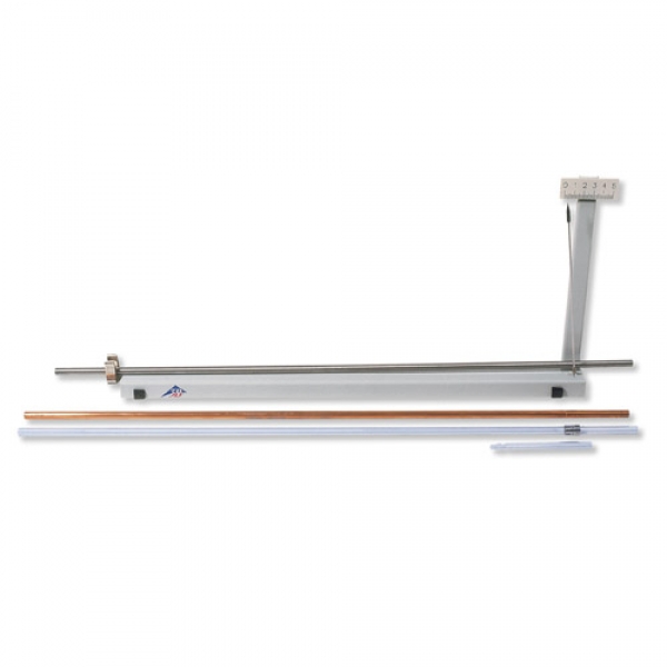 Zur Messung der Längenausdehnung fester Stoffe. Grundleiste mit Klemmfeder, Zeiger, Skala und Schlaucholive. Einschließlich drei Rohrproben, Eisen, Kupfer und Glas.