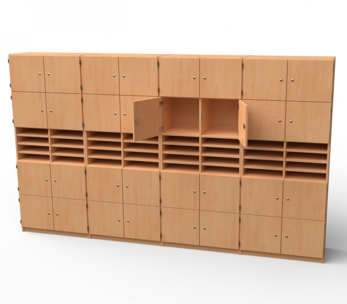 Schrankwand-Set SIMONE Gesamtmaß: BxHxT 320x190x40 cm bestehend aus: 4 x Lehrerfachschrank, BxHxT 80x190x40 cm Fachgröße der Lehrerfächer BxHxT 37x34x35 cm 2 x 4 abschließbare Fächer 2 x 4 offene Postfächer