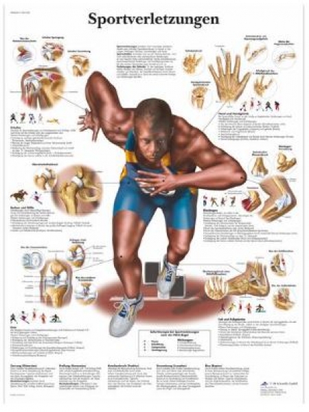 Diese farbige, anatomische Lehrtafel zeigt die häufigsten Verletzungen der gängigen Sportarten.