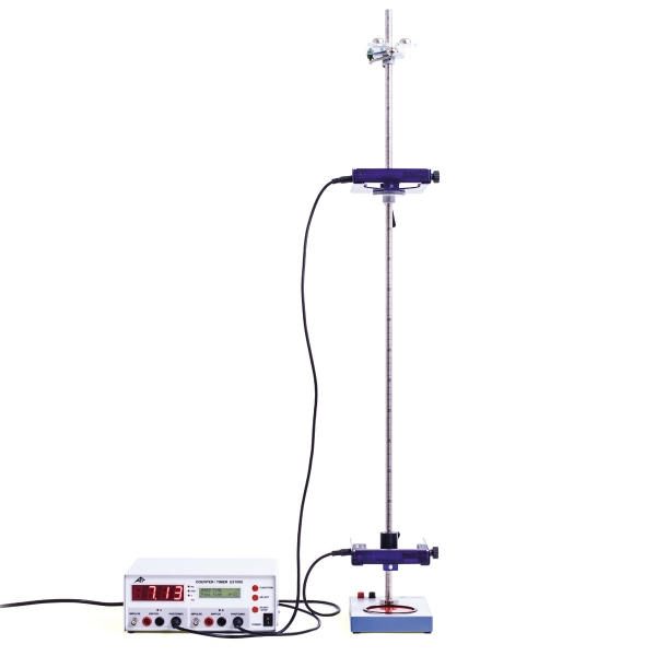 Gerät zur Messung der Fallzeit einer Kugel in Abhängigkeit der Fallhöhe in Verbindung mit einem Digitalzähler.