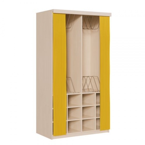 Der Korpus besteht aus 19 mm starker E1-Spanplatte, die für ihre Langlebigkeit und Stabilität bekannt ist. Das Dekor des Möbels können Sie natürlich bei Bestellung wählen. Ebenso ist die Farbe des Vorhanges auszuwählen.