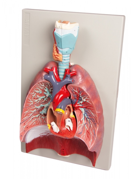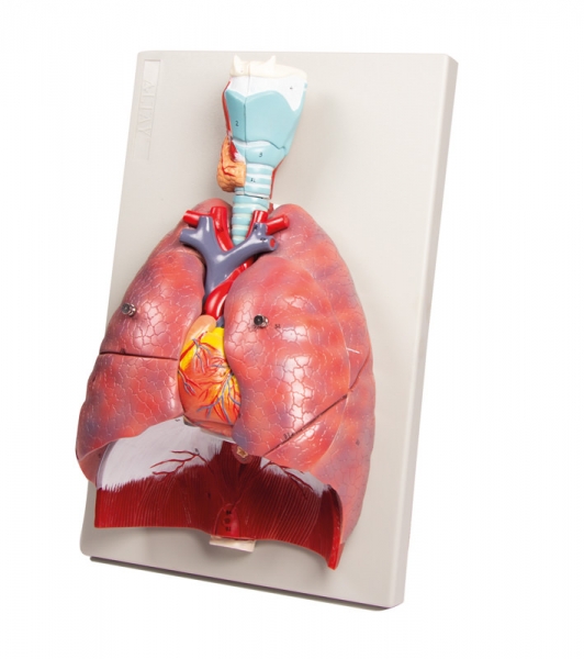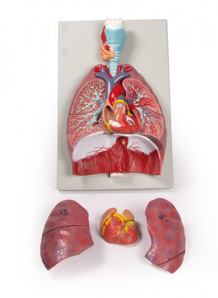 Darstellung der gesamten Atemwege in Lebensgröße. Das Modell besteht aus sieben Teilen, wobei der Kehlkopf in der Sagittalebene eröffnet werden kann, die Lungen in der Frontalebene. Das Herz ist aus zwei Teilen zusammengesetzt. Auf Grundplatte montiert.