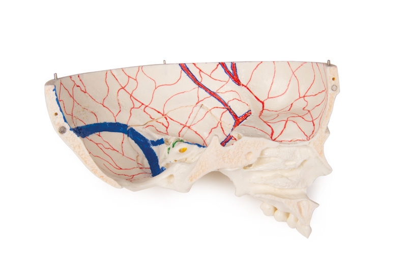 Das SchĂ€deldach ist eröffnet und abnehmbar. Knöcherne Impressionen des sinus sagittalis, des sinus transversus und des sinus sigmoideus wie auch der HirnhautgefĂ€ĂŸe sind bemalt. Die SchĂ€delbasis ist sagittal geschnitten in der Form, dass der Schnitt auf einer Seite durch eine Siebplatte und ein weiterer Schnitt mit gleicher Ebene durch die andere Siebplatte des Siebbeins verlĂ€uft, was die Christa galli und die Lamina perpendicularis wie auch die ganze Nasenscheidewand intakt lĂ€sst. Die Strukturen der vorderen, mittleren und hinteren SchĂ€delgrube sind einfach zugĂ€nglich. Man kann direkt die Nasenhöhle, die Nasenmuschel, das Septum sowie den knöchernen Rachenraum und Nasenrachenraum sehen. Die Nasenscheidewand kann aus den umgebenden Knochenstrukturen entnommen werden. Das herausnehmbare SchlĂ€fenbein zeigt einen vollstĂ€ndigen Ă€ußeren Gehörgang.