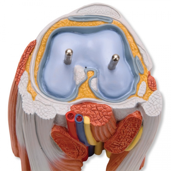 Das lebensgroße Modell ist im Kniegelenk horizontal teilbar und ermöglicht so die Ansicht der Gelenkstrukturen. Der M. gastrocnemius ist abnehmbar. Lieferung auf Sockel.