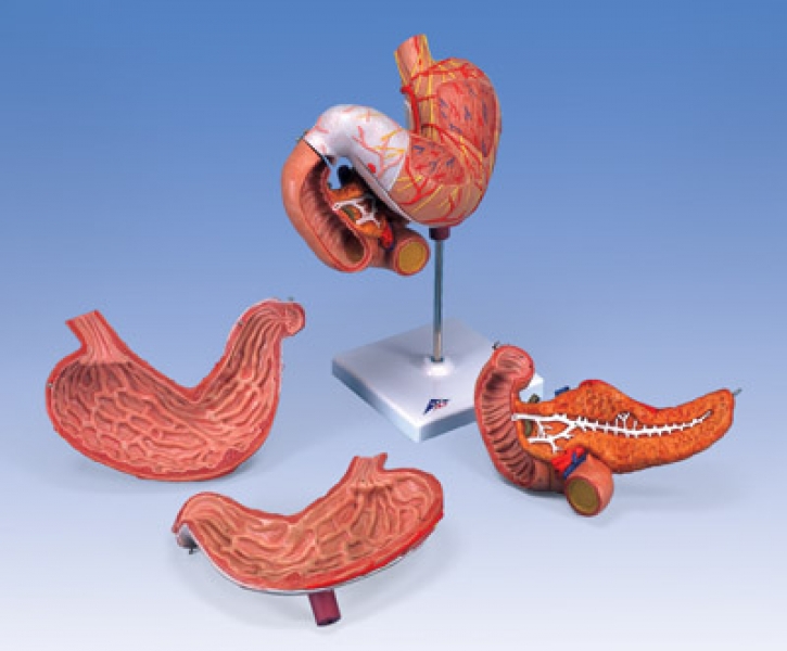 Die vordere Magenhälfte, die eröffnete Bauchspeicheldrüse und Zwölffingerdarm sind abnehmbar. Dargestellt sind: