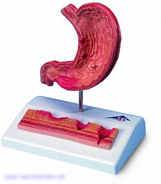Dieses 3B Scientific® Pathologie Modell zeigt verschiedene Stadien der Magenschleimhautentzündung (= Gastritis) vom leichten Magengeschwür (= Ulkus) bis hin zum Magendurchbruch (= Perforation). Der Magenschnitt mit Ansatz von Speiseröhre und Zwölffingerdarm in ½ natürlicher Größe zeigt folgende pathologische Veränderungen: