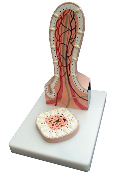 Das 2-teilige Anschauungsmodell in mehrfacher Vergrößerung einer Darmzotte des Dünndarms zeigt die anatomischen Details in einem transversen und einem longitudinalen Schnitt.