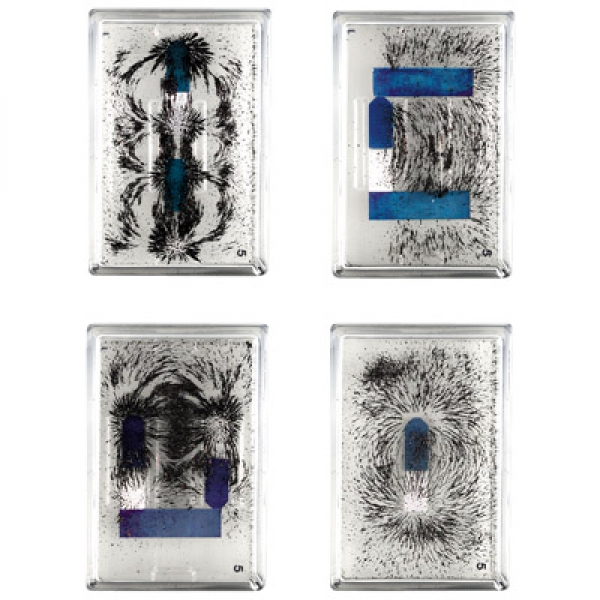 Die mit Eisenfeilspänen zu bestreuenden Acrylglas-Kästen sind mit einer Aussparung versehen, so dass die verwendeten Eisenfeilspäne wieder in die Aufbewahrungsflasche zurückgefüllt werden können.