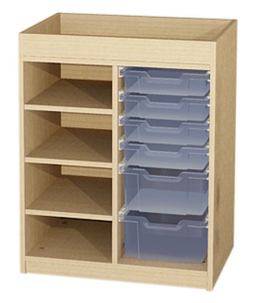 Materialcontainer, 2-reihigBxHxT 70,2x80x50 cm offen, Mittelwand, links: offen, 3 Einlegebödenrechts: 2 hohe Kunststoffkästenund 4 flache Kunststoffkästenmit Aufkantung