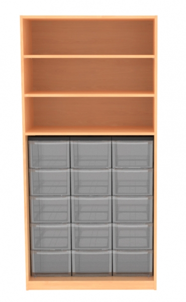 Materialschrank, BxHxT 92 x 190 x 50 cm offen, 2 verstellbare Einlegeböden 1 fester Fachboden 3 x 5 hohe Modulboxen
