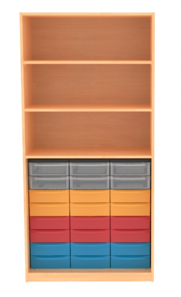Materialschrank, BxHxT 92 x 190 x 50 cm offen, 2 verstellbare Einlegeböden 1 fester Fachboden 3 x 8 flache Modulboxen
