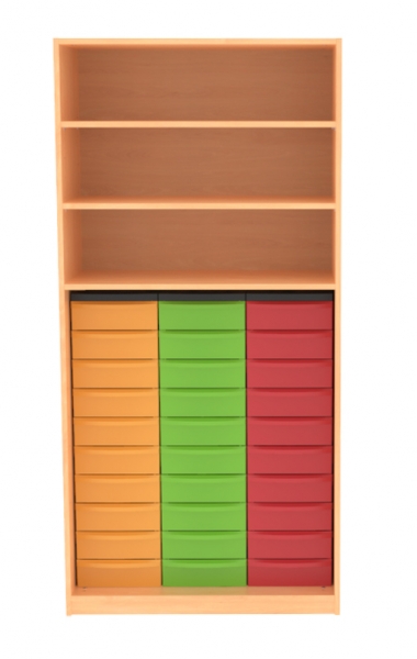 Materialschrank, BxHxT 92 x 190 x 50 cm offen, 2 verstellbare Einlegeböden 1 fester Fachboden 3 x 10 flache Modulboxen