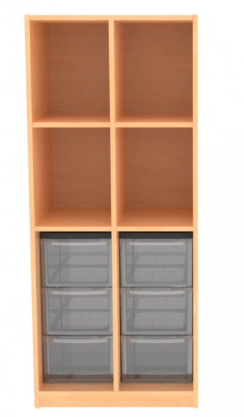 Materialschrank, BxHxT 64 x 152 x 50 cm offen, Mittelwand, 2 x 2 Einlegeböden 2 x 3 hohe Modulboxen