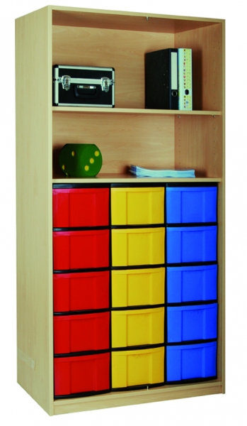 Materialschrank, BxHxT 104,3x190x50 cm oben: offen, 2 Einlegeböden1 fester Fachbodenunten: offen, 2 Trennwände, 3x5 hohe Kunststoffkästen