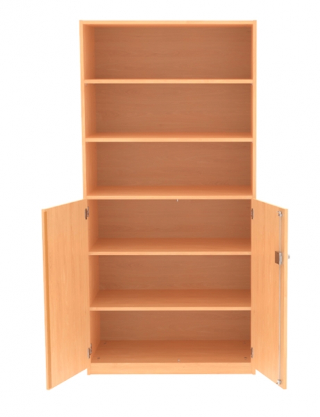 Materialschrank, BxHxT 92 x 190 x 50 cm oben: offen, 2 verstellbare Einlegeböden 1 fester Fachboden unten: 2 Türen, abschließbar, Dreholive, 2 verstellbare Einlegeböden