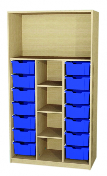 Materialschrank, BxHxT 104,3x190x50 cm offen, oben: 1 fester Fachbodenunten: 2 Trennwände, links: 7 hohe Kunststoffkästenmitte: 3 Einlegebödenrechts: 7 hohe Kunststoffkästen