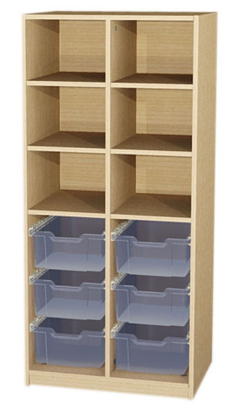 Materialschrank, BxHxT 70,2x152x50 cm offen, Mittelwand, 2x2 Einlegeböden2x1 fester Fachboden2x3 hohe Kunststoffkästen