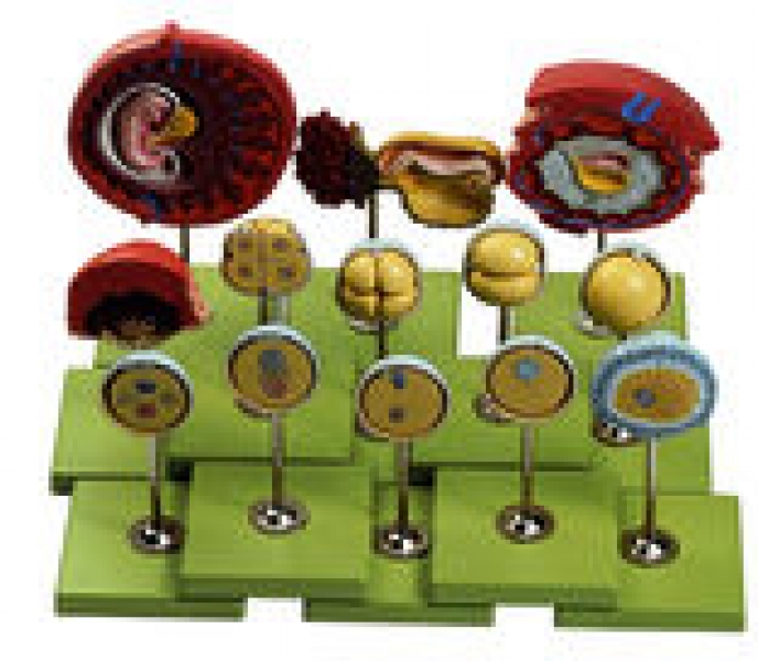 dargestellt an 13 Modellen aus SOMSO-Plast®. Jedes Modell einzeln auf Stativ mit grünem Sockel.