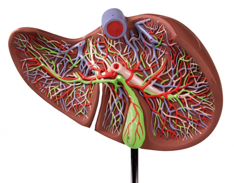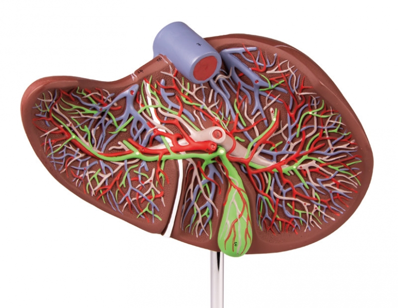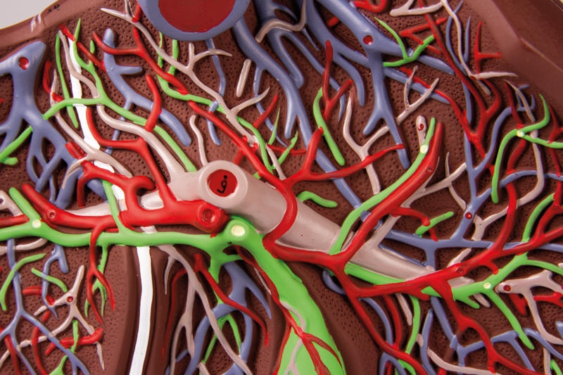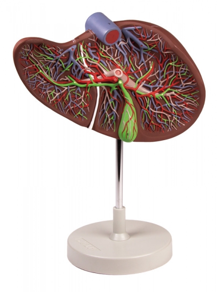 Aufgeschnittene Leber in 1,5-facher Vergrößerung, bei der die Anordnung von Arterien, Venen, Portalvene und Gallengang dargestellt ist. Mit Stativ.